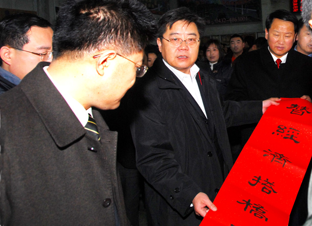 市长张晓霈(左一)以送春联的形式慰问在岗人员