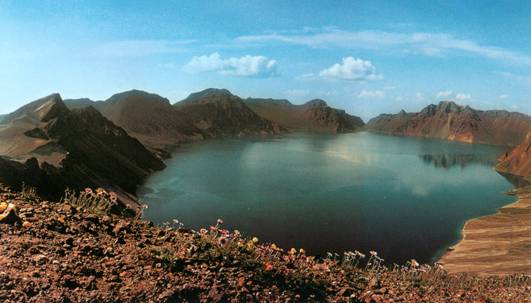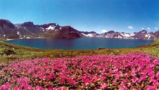 天池虽然在群峰环抱之中,海拔只有2194米,但却是我国最高的火口湖。它大体上呈椭圆形,南北长4.85公里,东西宽3.35公里,面积9.82平方公里,周长13.1公里。水很深,平均深度为204米,最深处373米,是我国最深的湖泊,总蓄水量约达20亿立方米。 天池的水从一个小缺口上溢出来,流出约1000多米,从悬崖上往下泻,就成著名的长白山大瀑布。大瀑布高达60余米,很壮观,距瀑布200米远可以听到它的轰鸣声。大瀑布流下的水汇入松花江,是松花江的一个源头。在长白瀑布不远处不远还有长白温泉,这是一个分布面积达1000平方米的温泉群,共有13眼向外喷涌。 |