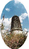 农安古城的辽代古塔,建于公元983-1030年间。古塔为实心砖砌建筑,八角13层,高近40米。第一层檐下为砖雕斗拱,八面均修有壶门。塔自下而上逐层收份,塔尖直指篮天,塔檐层层飞展,檐角风铃琮琮作响,铃声悠扬悦耳。农安县地处平原,辽塔矗立如鸡群鹤立,于几十里外即可见其英姿。