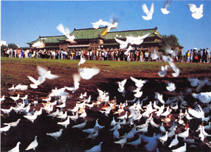 文化广场原名地质宫广场,是全市最大的城市广场,坐落在市区中心,总面积20.5公顷,历史上地质宫广场曾被规划为伪满洲国的国都广场。广场以新民主大街道路中心线至地质宫广场主楼中央为南北主轴,中轴线全长429米,由南向北依次排列为:广场主入口、南北主路。中心广场的中央是广场太阳鸟雕塑,,北面是露天音乐坛,跨过东西主路是1万平方米的主楼前庭广场,最北端为地质宫主楼。整个中轴线采用天然花岗石铺砌,给人以自然、庄严、厚重的感觉。中心广场至主入口两侧均为广场绿化用地和园路用地,总面积4万平方米,还饲养了3000只广场鸽,为整个广场增添情趣。