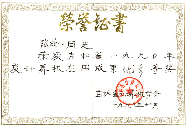 1990年12月获吉林省1990年度计算机应用成果优秀奖